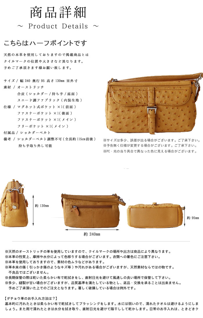 一度は、持ってみたい憧れの本物素材!また、ダチョウの革は軽いし丈夫で長持ちな為、バッグにはとても相性が◎!オーストリッチの特徴であるクィルマークは、だちょうの全体の40%しか取れない貴重な部位を使用しているため、クロコダイル(ワニ革)と同等の高級素材と言われています!絶対にお勧めの本革オーストリッチをぜひ手にとってください! ■サイズ詳細は画像を参照 (お急ぎの場合はご確認下さい) ※天然のオーストリッチの革を使用していますので、クイルマークの位置や出方は商品により異なります ※北海道、九州、沖縄、離島に関しては別途送料が必要となります。