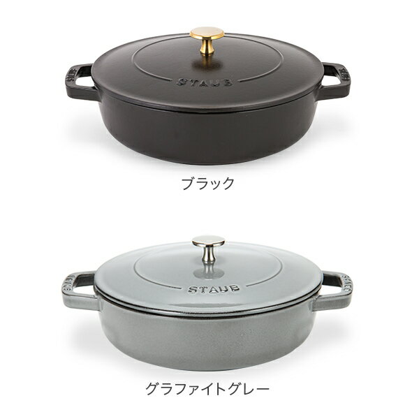 商品名ストウブ【Staub】ブレイザー ソテーパン 24cmカラーブラック(12612425 / 40511-473-0)グラファイトグレー(12612418 / 40511-471-0)チェリー/レッド(12612406 / 40511-475-0)サイズ直径:24cm幅(取っ手含む):31.5cm高さ:11.6cm(フタ含む)/7cm(フタ除く)重量:4.2kg容量:2.4L素材鋳鉄ホーロー*ブラックの蓋の金色のつまみは真鍮製、その他カラーの蓋の銀色のつまみはニッケル製です。