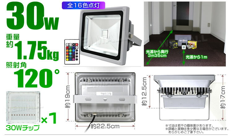 ライトの上下多角度を調整出来るようになっていますので、とても便利です! 専用リモコン付きで、遠隔操作可能! 商品仕様 サイズ(約):225mm×190mm×125mm 重量(約):1.75kg 照射角:120度 LED発光色:16色(RGB3色の組合せ) 点灯パターン:ストロボ点灯/フラッシュ点灯/フェード点灯/スムース点灯 入力電圧:85〜265V 防水規格:IP65 本体:アルミ合金 照射面:強化ガラス コードの長さ(約):25cm(プラグ無・スイッチ無) 商品内容 LED投光器30W RGB ×1 リモコン ×1 注意事項 ・プラグは付属しておりません。
