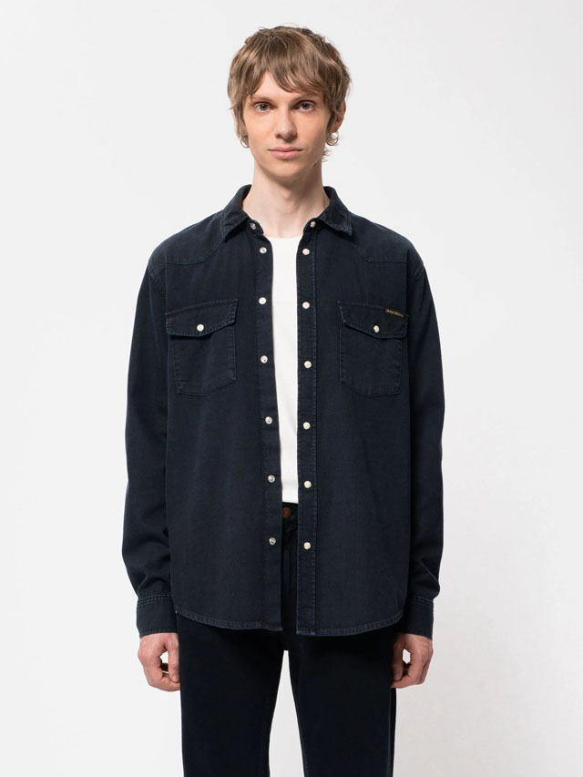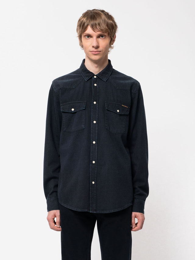 もちろん、素材と加工にこだわった、この風合いのよさは格別! 女性ウケの良い、「袖捲りスタイル」で、 マッチョな二の腕をチラ魅せすれば、 個性あふれる変幻自在の、貴方様の着こなし姿に グッとくる女性は少なくないはず!? ボトムは味出しデニムで、鉄板カジュアルを狙ってください!!! 【あす楽_土曜営業】【あす楽_日曜営業】Nudie Jeans co (ヌーディージーンズ)GEORGE BLACK HOME Indigo blue overdyed black, Regular fit, shirt made in organic cotton. デニムウェスタン/ウェスタンシャツ BLACK(ブルーブラック) サイズ詳細 肩幅 身幅 着丈 袖丈 MEDIUM(Mサイズ) 約45cm 約56cm 約73cm 約64cm LARGE(Lサイズ) 約48cm 約60cm 約76cm 約64cm #お手持ちのアイテムとの比較にご利用ください。