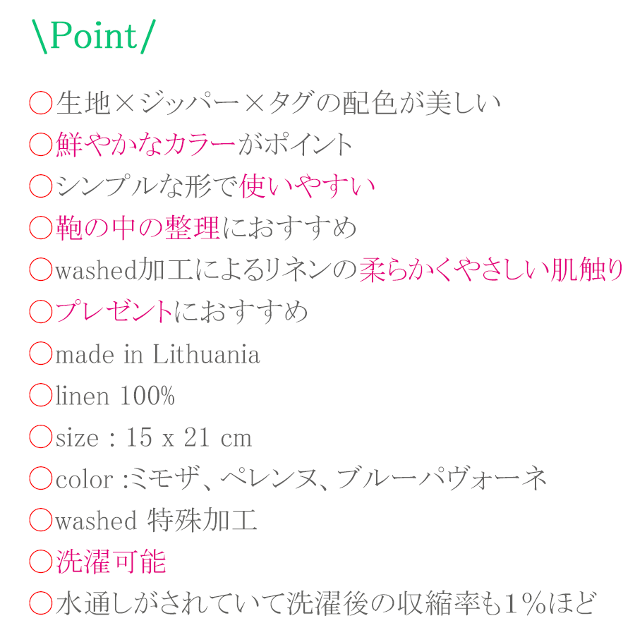 素材リネン100%商品説明生地×ジッパー×タグの配色が美しいマノン・ポーチ。